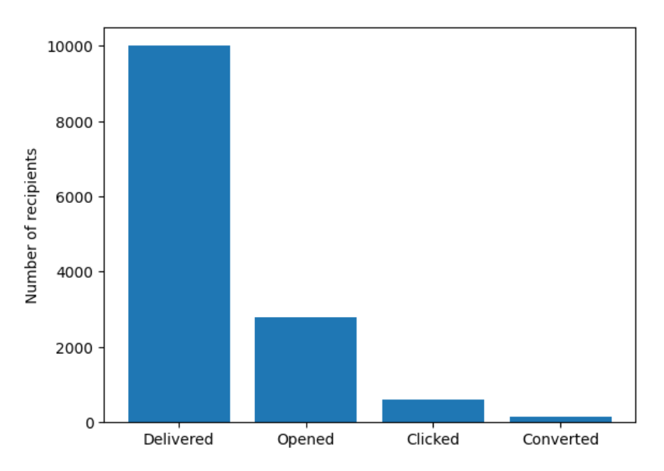 The following conversion chart illustrates the real-world behavior of email campaign recipients. It is clear that with each additional step, the number of users who complete the next step decreases, which underlines the importance of optimizing each individual phase of the campaign, from the email subject line to the landing page.