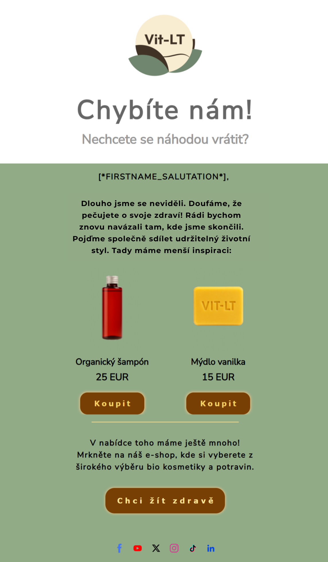 První e-mail s názvem "Vit-LT, Chybíte nám" znovu naváže kontakt se zákazníkem. V e-mailu vyjádříme přání dále budovat vztah, aniž bychom příliš tlačili na pilu. K tomu nám stačí jeden nebo dva odstavce, silný titulek a doporučení produktu.