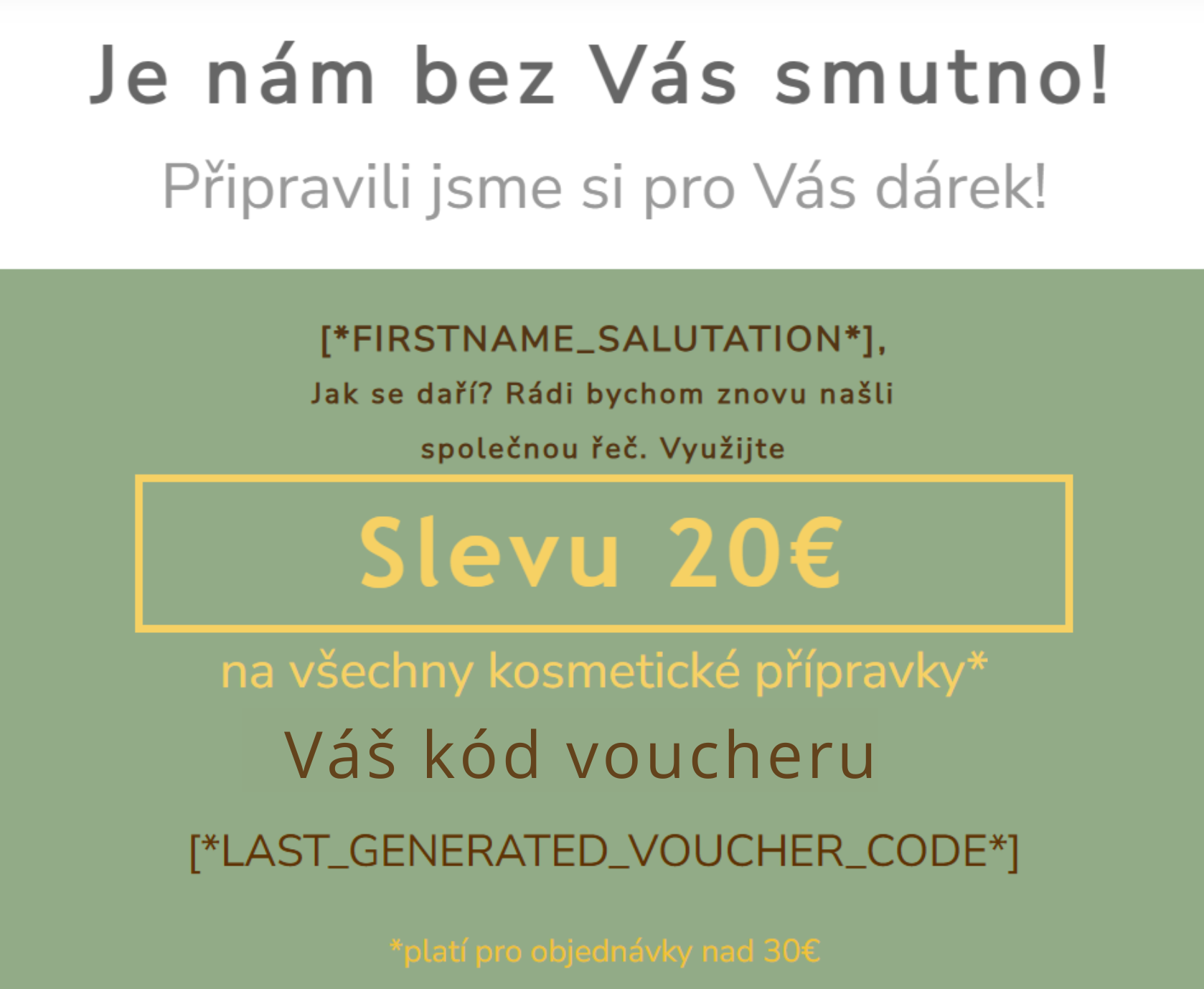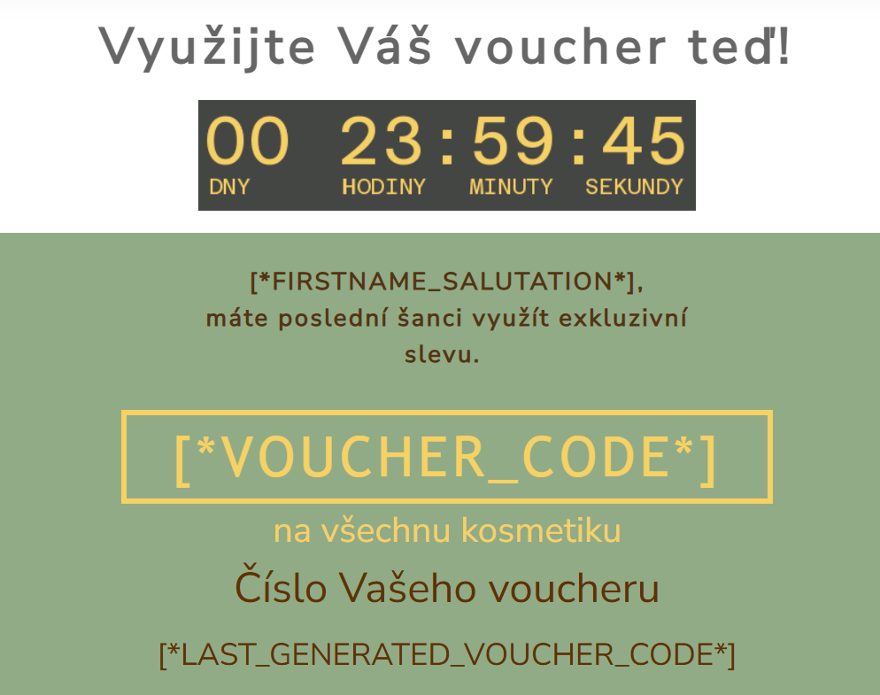 V další sadě e-mailů budeme zákazníky motivovat poukazem. Zpráva zůstává stejná, pouze je přidán kód voucheru. Použijte proměnné personalizace – Proměnné automatizace marketingu – Vouchery – Kód posledního vygenerovaného voucheru.
