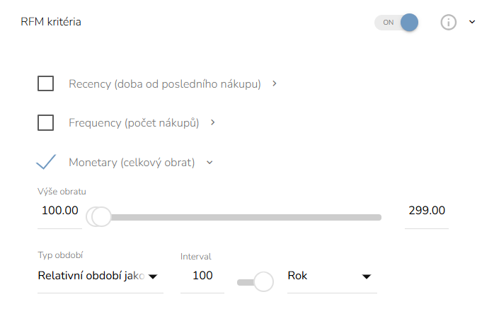 Segmenty vytvoříme v aplikaci Administrace & Loajalita. Hlavním nastavením, které hledáme, jsou kritéria RFM. Monetary (celkový obrat) nastavíme na výše uvedené hodnoty. V Typu období nastavíme interval tak, aby pokrýval dostatečně dlouhou dobu.