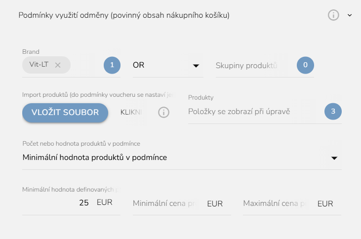 Vytvoříme tři vouchery: na 10 €, 15 € a 20 €. Automatizace bude sama přidělovat vouchery, takže jediné podmínky, které nastavujeme, jsou platné produkty, požadovaný počet produktů (minimálně 1), minimální hodnotu produktu a časovou platnost.