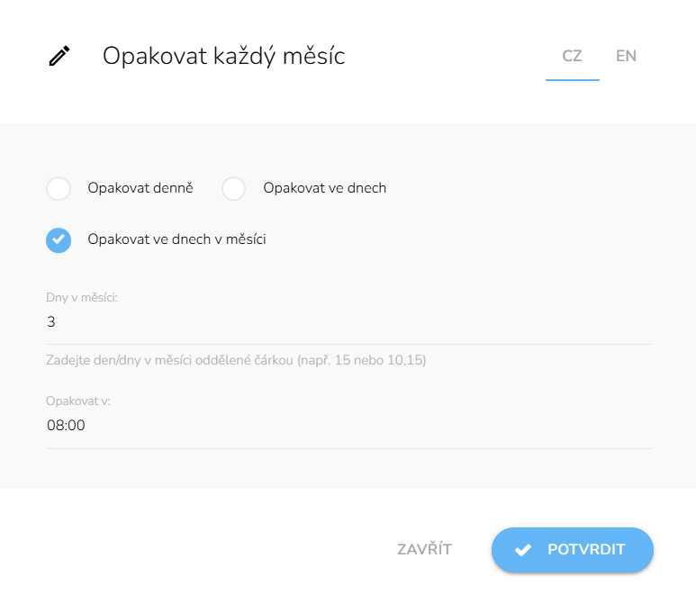 Začneme spouštěčem. Použijeme uzel "Opakovat", který spustí pracovní postup každý měsíc v určitý čas. Nastavíme, aby se pracovní postup spouštěl třetí den v měsíci v 8:00.