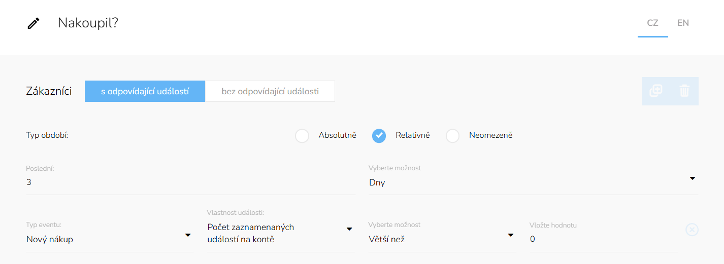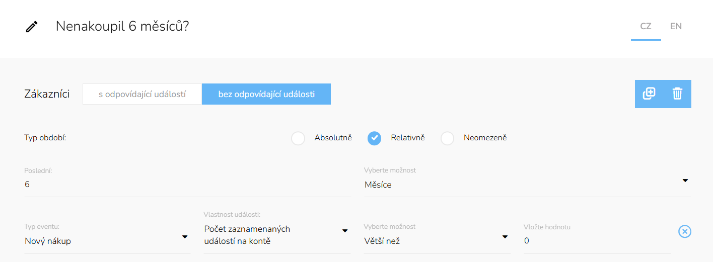 Poté musíme zajistit, aby zákazník nenakoupil v posledních šesti měsících. Zvolte možnost "Zákazníci bez odpovídající události" a nastavte událost "počet zaznamenaných událostí na kontě" v posledních 6 měsících.