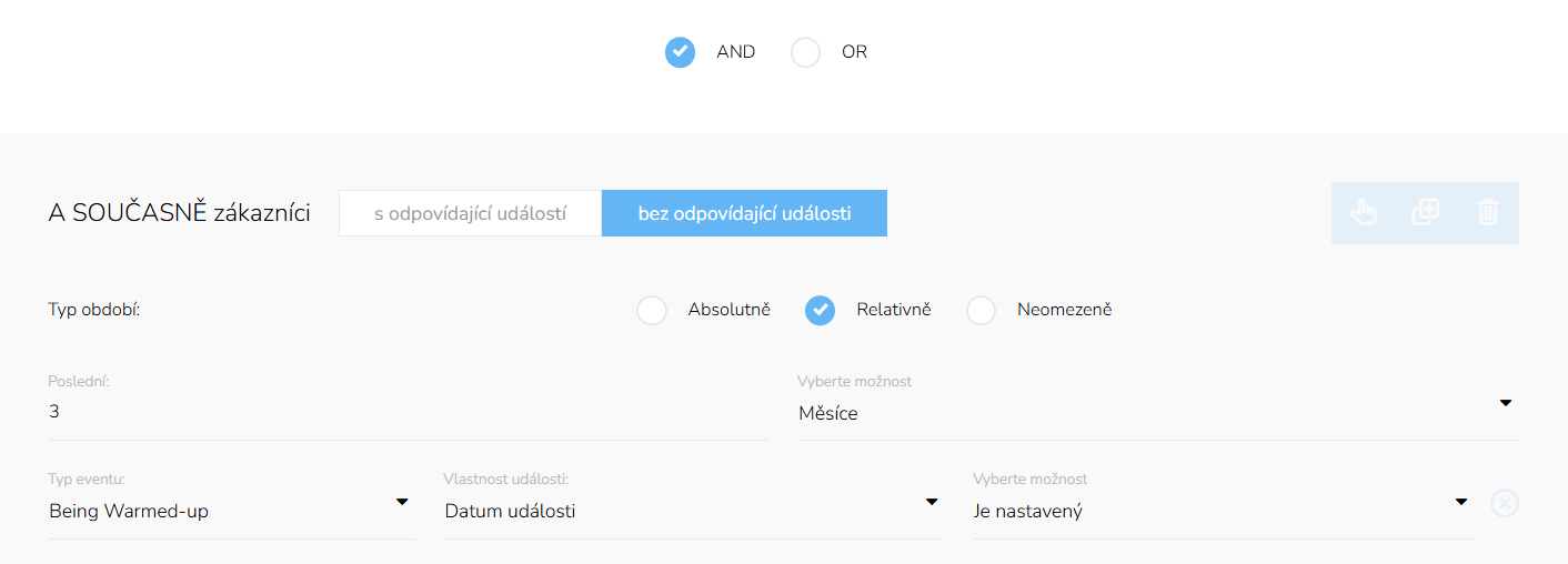 Druhá část podmínky zajišťuje, že na zákazníka nebyl v poslední době zaměřen podobný scénář, jako zrovna tvoříme. Přidejte podmínku a vložte "Being Warmed Up". Tím zajistíte, že na zákazníka nebudou cílit dva stejné scénáře naráz.