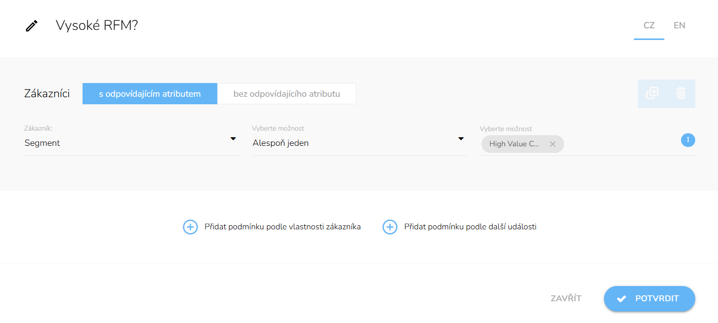 Pro určení hodnoty zákazníka stanovíme postupně tři podmínky. Stačí nastavit atribut zákazníka na vysokou nebo střední (ostatní zákazníci tedy logicky budou ti s nízkou hodnotou).