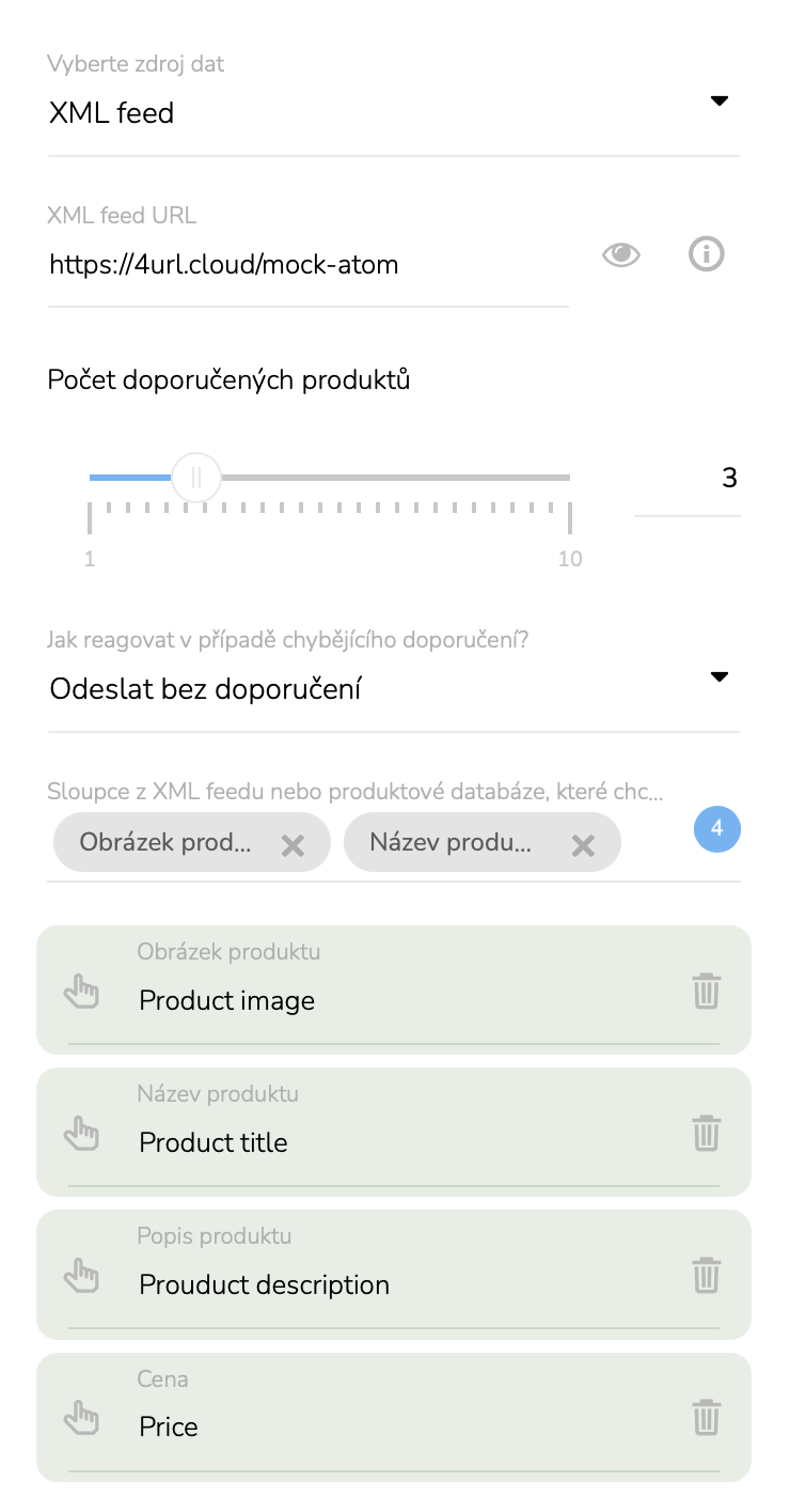 Vložte URL adresu produktů, definujte počet doporučených položek, co se stane v případě, že doporučení chybí, a nakonec, jaký typ informací chcete v e-mailu mít.