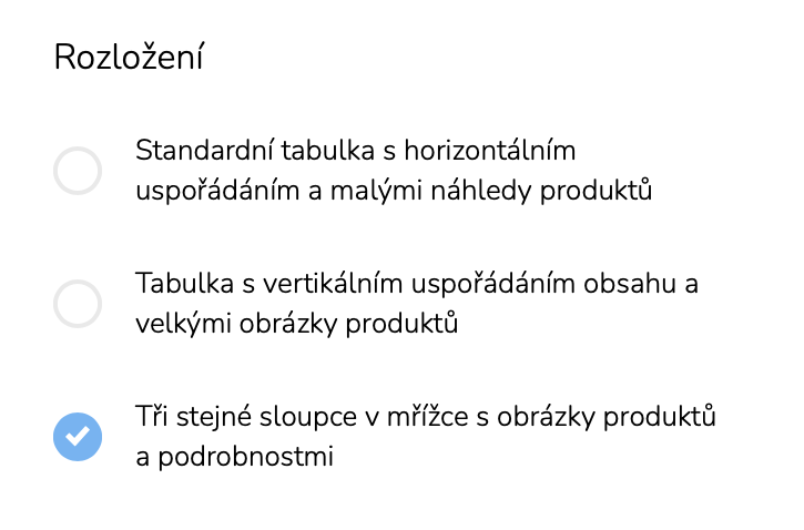 Ve výchozím nastavení se produkty zobrazují ve svislém seznamu. Pokud je chcete zobrazit vedle sebe, klikněte na ikonu Rozložení a vyberte třetí možnost.