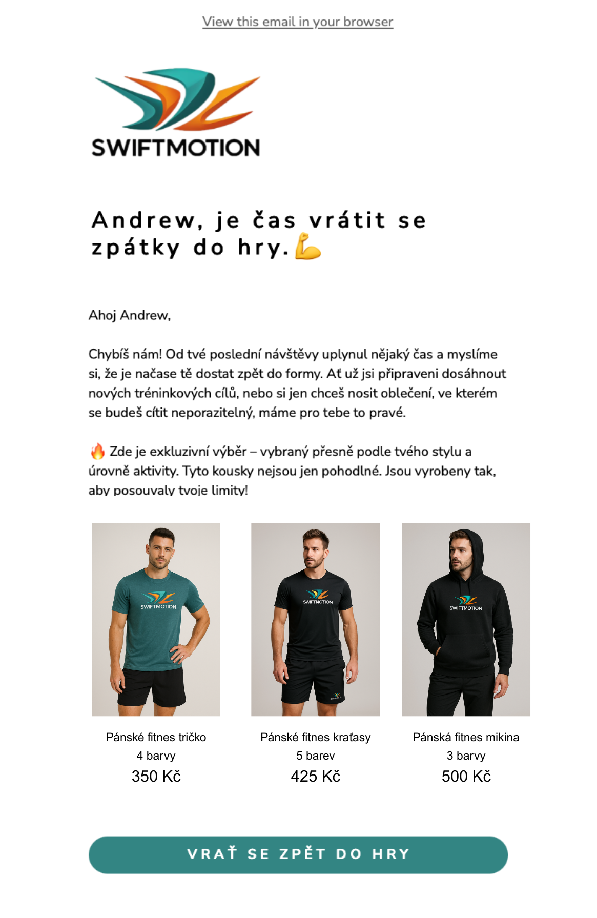 Pro účely tohoto článku použijeme fiktivní značku Swiftmotion, prodejce stylového sportovního oblečení. V našem příkladu čelí rostoucímu odchodu zákazníků a využívá platformu CareCloud k identifikaci rizikových zákazníků a jejich opětovnému navrácení prostřednictvím komplexního automatizovaného scénáře.