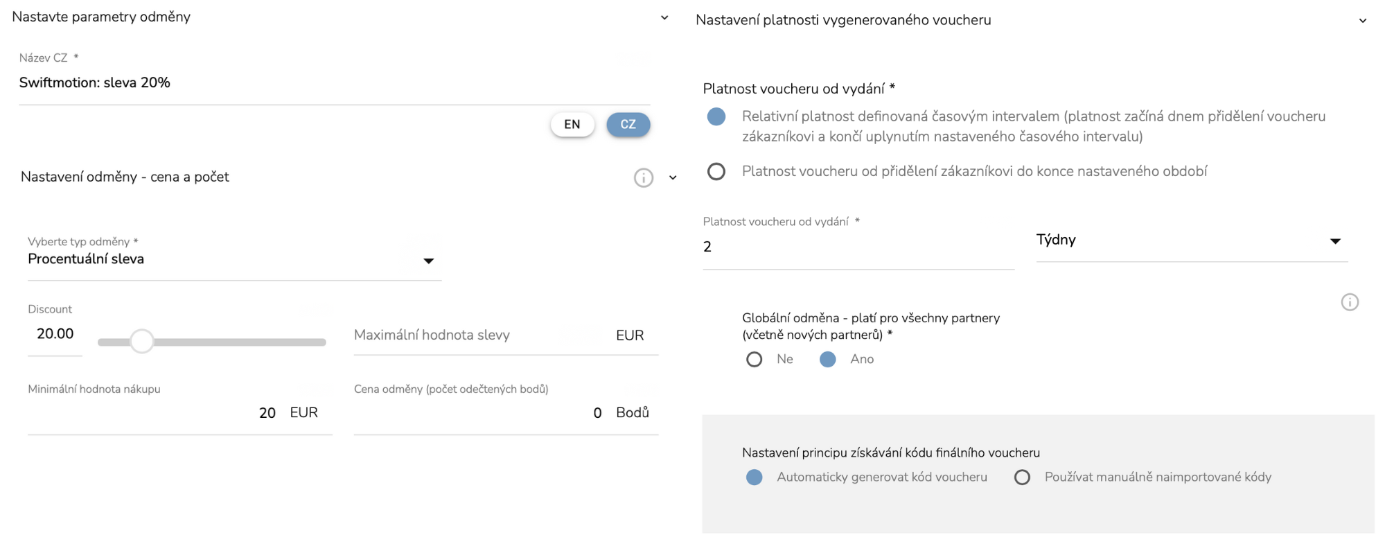 Chcete-li vytvořit časově omezenou slevu, přejděte do sekce Kampaňové odměny a vyberte možnost Produkt za zvýhodněnou cenu. V našem příkladu zákazníci obdrží 20% slevový voucher. Podívejte se na snímek obrazovky níže, kde uvidíte, jak jej správně nastavit: